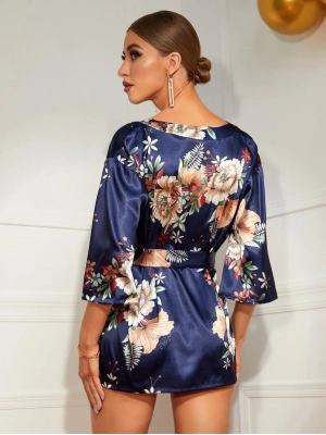 Lacivert Kadife Dantelli Sabahlık & Gecelik Takım 3' Lü - 1432