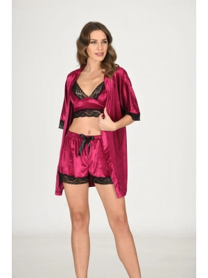 Fuşya Kadife Dantelli Sabahlık & Gecelik Takım 3' Lü - 1437