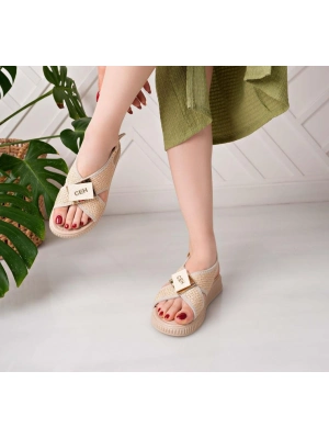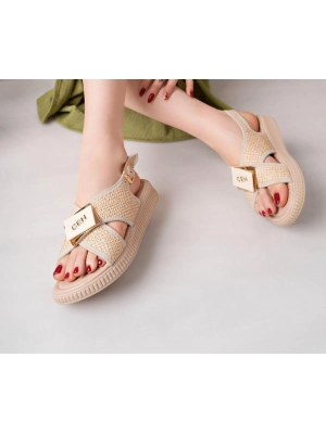 Cate Bej Hasır Cilt Sandalet - Bamido