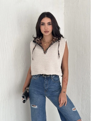 Astarlı Kapşonlu Kuzu Yelek Beyaz T1243