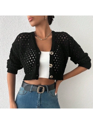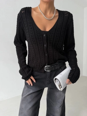 Küçük Düğmeli Küçük Örgülü Triko Hırka Siyah