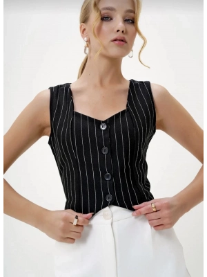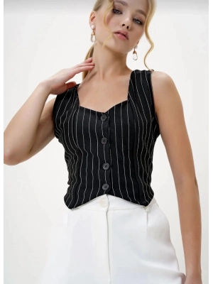 Çizgili Krep Düğmeli Yelek Siyah S3395