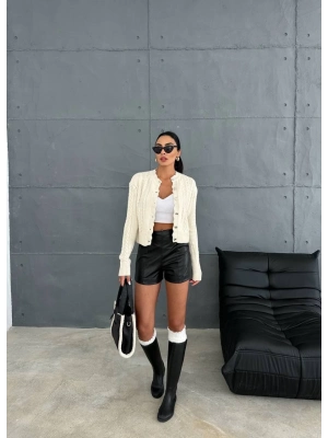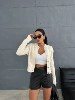 Küçük Düğmeli Küçük Örgülü Triko Hırka Beyaz