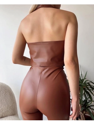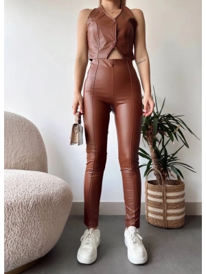 Çizgili Krep Düğmeli Yelek Kahve S3395