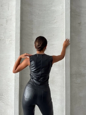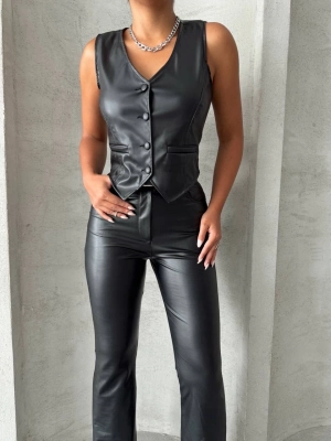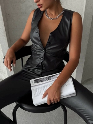 Kaplama Düğmeli Deri Yelek Siyah S24398