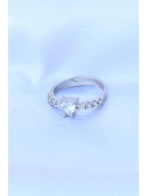 Pirinç Gümüş Renk Ayarlanabilir Zirkon Taşlı Minimal Kalp Yüzük - Bamido