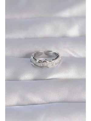 Bamido Pirinç Gümüş Renk Zirkon Taşlı Baget Su Yolu Model Ayarlanabilir Yüzük - Lisinya